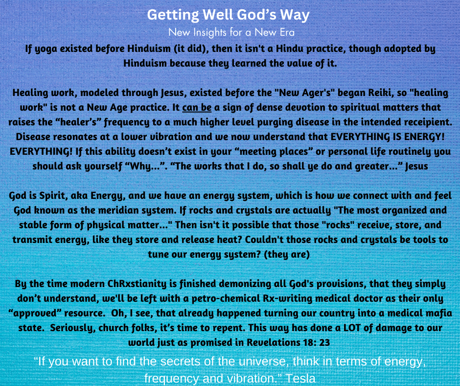 ONE of the missions GOD IS INSISTING ON is the professing BODY OF CHRIST in the USA especially, learn some new insights that will show HIS AMAZING CREATION but will also reveal how unloving, intolerant, and rude they’ve been to people who’ve come along their path. I periodically get “thrown into” the “NEW AGE” pile with an attitude of disgust is how it’s felt. I shrug my shoulders and go on because I know me and I know this journey I’m having and that’s not an accurate label or judgment. It’s simply people that have been brainwashed by the media that supports the lifestyle that keeps us indebted, enslaved and entangled pouring our resources into their choices for us, NOT GOD’S! YES, I am having a different journey where I’m learning about health and healing without relying on Rx drugs and all that comes with this, including corruption and spoil. Look at the health of the nation, the world! If you think this is health care then you have no clue what else is available unless you step out of that mindset. PRAY. ASK GOD TO TEACH YOU HIS TRUTH and then prayerfully move forward.