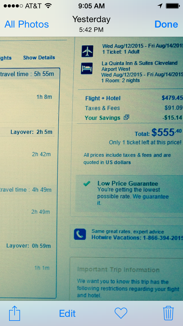 So, here I am on Hotwire shopping for travel packages for my trip to go see the executive director of the insurance product and one of the options is for a flight with a “Total Travel Time” of 5 hrs 55 minutes. Mom, Sis, and I all laughed and said, “Gotta take that one” and so I did. Now you have to understand that because of this journey money is a concern. I don’t need to be jumping on a plane and going to Ohio on a whim. Seeing this flight travel time in a familiar way helped me sense God was in this and that I should go. I entered the debit card information and when the total rang up I belly-laughed and so did Mom and Pam, my sister. We couldn’t believe it. It was $555.40. I immediately thought “Dang. I wish it had been .41 then it would be all 5’s.” Before I could even share that thought the system recalculated and it came up $552.53, ALL 5’s! We laughed and I took pictures of all the screens showing this shown below. The day before I left on this trip I pulled into a parking spot and when I turned around to hit the lock on the key fob of the borrowed vehicle I drive and I noticed that the bright red car’s license plate ended in 5555. I laughed and went in.