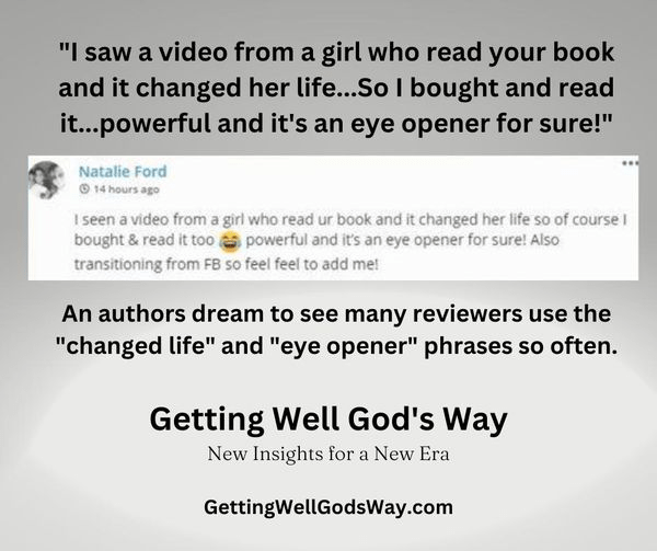 The Getting Well God’s Way book she holds up is the first version released in 2015. Since then, it’s had two major updates of about 50 pages. It will soon be taken off of Amazon as it’s being released under a new title/brand/effort along with the launching of a podcast and online community. If you FOLLOW this blog (top right side bar of page) these launches will be posted here and you’ll receive an email notification of where to go to see what we’re up to next.