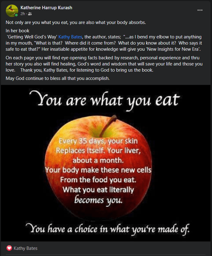 Actually, I didn’t want to write a review of the first part because there are obviously different things happening in churches in the USA than in the churches in the more than 3 dozen Christian countries that I visited or lived in: according to Kathy, they have set up junk food and soft drink vending machines in their churches. And the author describes how she runs into walls of convenience in her churches, with which priests and believers stick to this decidedly unhealthy diet, although the Bible they proclaim or which they believe/claim to follow says completely different things, and people are obviously getting sick and sicker due to their poor diet, which, thanks to incredible ingredients in the USA, must be even worse than in most other countries. And according to the author, this poor diet is based on this poor diet, numerous consequences and networks of uninformed doctors, false diagnoses, poor or no suitable treatment at all, and a huge machinery of pharmaceuticals and health insurance, which contribute nothing to healing the sick, but which open the door to corruption and money-making at the expense of health for the population. Kathy Bates describes her own ordeal through practices without finding help there…, and how she has finally found her own personal healing path herself in direct contact with God and finds it again and again, so that she hasn’t approached a conventional doctor for help for over 30 years (except surgeons). For readers, she has written down her path and compiled numerous passages from the Bible that provide information on how to eat, treat your body, choose a path that brings or maintains health, and should avoid harmful pleasures. The exciting thing is that when you get involved in the text and Kathy’s path, it also opens channels or gates in the reader so that you can get in closer contact with God yourself. And perhaps more people will then understand that the “bad pleasures” – as strange as that may sound to the ears of Central Europeans – are actually closing the channels for a connection, be it through all kinds of luxury goods, medicines, technology. This path, of each individual’s self-discovery, is a side effect of reading the book. But probably certainly in Kathy Bates’s mind, because she would like Christians to focus more on the teachings from the Bible again, on which their faith is supposedly based, but which do not seem to be used in the US Church and not mentioned in Sunday School. The author’s hope is that the entire economy around pharmaceuticals and the useless part of conventional medicine, where it doesn’t help but makes it worse, as she experiences it and other people have also learned in her book, can be replaced by Christians remembering that their body is the temple of God, they care for it and feed it healthily and so that most illnesses disappear by themselves or at least improve if you refrain from eating junk food and decide on a diet that is appropriate for the body. This one decision could turn the entire development on earth in a healthy, better direction. It makes sense to me, because a healthy brain also thinks more sensibly, can follow reason and give space to wisdom where food additives have a devastating effect…