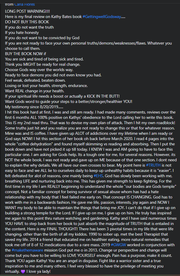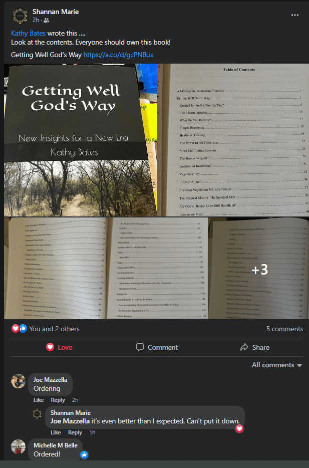 You can purchase/explore the Getting Well God’s Way book listing and some reviews on Amazon at this link: https://www.amazon.com/Getting-Well-Gods-Kathy-Bates/dp/1508839514/ref=sr_1_1?dchild=1&keywords=getting+well+gods+way+by+kathy+bates&qid=1619377300&sr=8-1