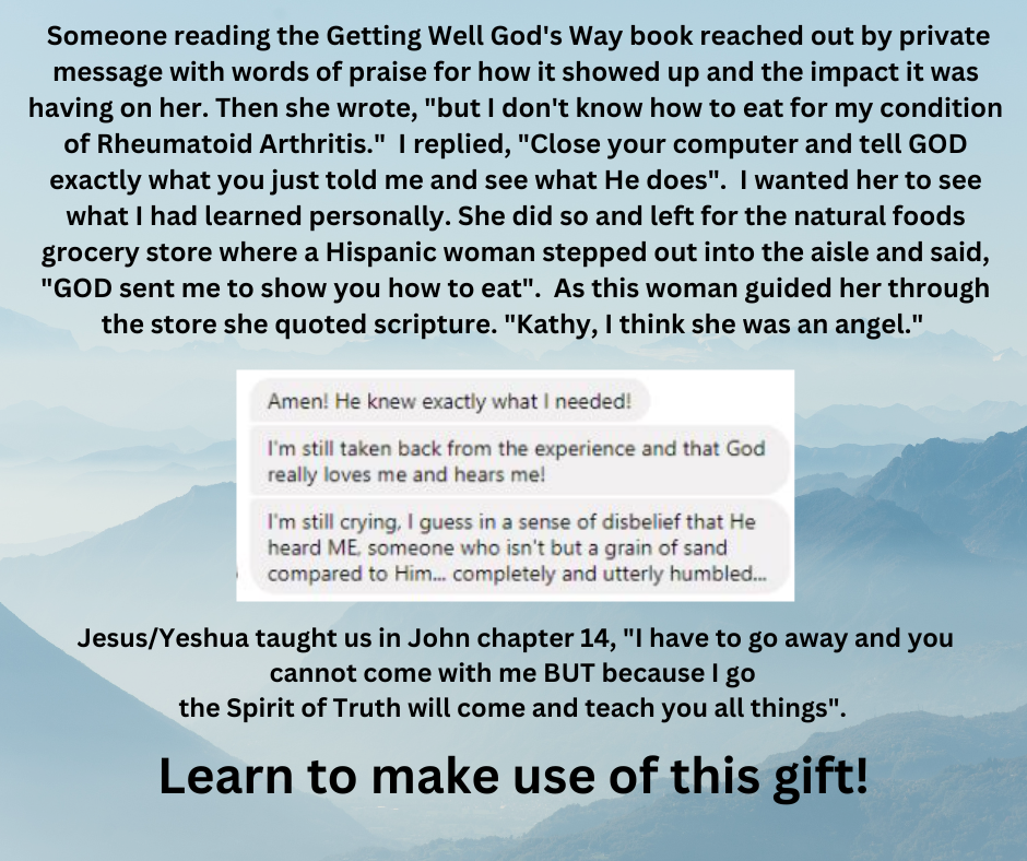 If you’ve read the book I wrote, you get me and if/when I have doubts I always have my reader’s shared experiences to remind me. This beautiful woman has an amazing story of what happened when she went to the grocery store after writing to thank me for my obedience to write the book. She said “I don’t know how to eat for my Rheumatoid Arthritis”. I suggested that she close her computer, tell GOD that same thing and then wait to see what happens. She went to the grocery store and a Hispanic woman stepped in front of her cart and said, “GOD sent me to show you how to eat.” This woman walked her through the store, quoting scripture and educating her. She wrote me later balling her eyes out…”I am but a grain of sand and yet GOD met me in that store…I think this woman was an angel”. I did too. And THIS is the kind of thing that can accompany that book…It helps us see that HE’S HERE WAITING FOR US TO TURN TO HIM!
