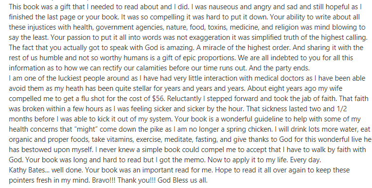 Then another man in Maryland bought 50 of them to give out in his town. The first time we spoke on the phone and were about to hang up he too began crying and declaring that he’d prayed that book in for over a decade and praised that I’d done more than he could imagine. He too has a great story of recovering his health and coming off of a lot of prescribed drugs. His parting words were, “You’re a messenger from God and if we don’t listen to you we deserve what comes next.”
