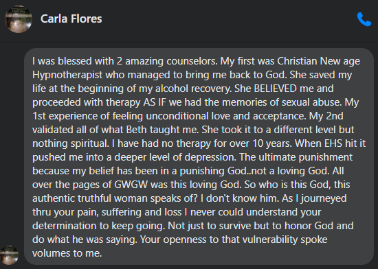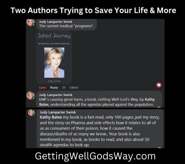 Below you’ll see a private message from a woman who was impacted deeply by the book. She’s reading it for a third time. She mentions “EHS” in this post. We are in a club nobody wants to be in, injured by wireless technology, resulting in a condition known as Electro Hypersensitivity (EHS). Also known as “Radio Wave Sickness” or “Microwave Sickness”. This condition essentially means that we can’t be around wireless technology and is a condition that a NIH.gov site now refers to as a “world wide plague which began with the launch of wireless technology”. You won’t learn about it in the mainstream because the tv sells ads to the providers. I’ll post a link below where you can learn more about it including a list of symptoms. You need to know how you’re body is responding to this tech saturated world. What I wanted you to see here is how her beliefs about God changed reading the book. You never know what you’re story may do for others.